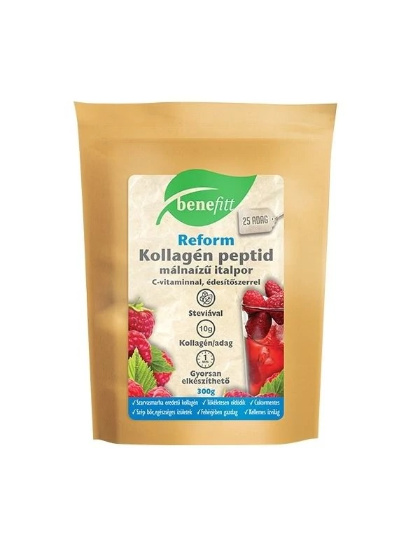 Kellemes ízű, kollagén peptidekben és C-vitaminban gazdag instant italpor. A kollagén a bőr- és a porcszerkezet nélkülözhetetlen vázanyaga. Szerepe van a bőr rugalmasságának megőrzésében, a porcszövet épségében. A C-vitamin hozzájárul a megfelelő kollagénképződéshez, a bőr, a porc- és csontszövet normál állapotának fenntartásához. Szarvasmarha eredetű kollagénnel Szép bőr & egészséges ízületek Adagonként 10 000mg kollagént és 200mg C-vitamin tartalmaz Közepes molekulatömegű és hatékony felszívódású hidrolizált kollagénből Gyorsan elkészíthető Tökéletesen oldódik Fehérjében gazdag Kellemes ízvilág Steviával Hozzáadott cukor és tartósítószer nélkül Természetes módon glutén- és laktózmentes Javasolt fogyasztás: az ajánlott napi adag (1 evőkanál/12 g) kollagén italport oldja fel 300 ml vízben és lehetőleg étkezés után fogyassza el. Időseknek, sportolóknak, fizikai munkát végzőknek különösen ajánlott. 2-3 hónap tartós fogyasztást követően tartson két hét szünetet! Összetevők: hidrolizált kollagén (szarvasmarha eredetű), Málna aroma, savanyúságot szabályozó anyag (citromsav), L-aszkorbinsav, színezék (céklavörös), édesítőszer (steviol glikozodok). Mentes üzem: Előállító üzemünkben búzát és egyéb gluténforrást, szóját, tojást, tej- és tejszármazékokat nem használunk fel. Tápérték 100 g termékben Energia: 1260 kJ (300 kcal) Zsír: 0 g Ebből telített zsírsavak 0 g Szénhidrát: 0 g Ebből cukor: 0 g Rost: 0 g Fehérje: 75 g Só: 0,3 g C-vitamin: 200 mg (NRV*: 250%) NRV*: Felnőttek számára ajánlott napi beviteli referenciaérték százalékban kifejezve. Tárolás: szobahőmérsékleten (15-25° C), száraz, idegen szagoktól elzárt helyen, kisgyermekek elől elzárva tárolandó. Felbontást követően a simítózár segítségével zárja vissza a termék csomagolását. Figyelmeztetés: Az ajánlott napi fogyasztási mennyiséget ne lépje túl! Önmagában ne fogyassza, mert a porszerű anyag fulladást okozhat!