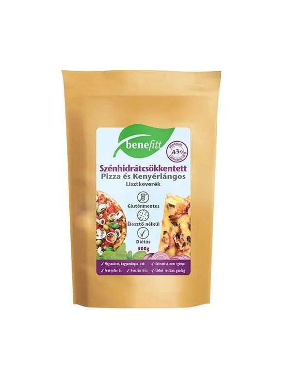 GLUTÉNMENTES BENEFITT SZÉNHIDRÁTCSÖKKENTETT PIZZA-KENYÉRLÁNGOS LISZTKEVERÉK 500G tápióka-keményítő, gluténmentes búzarost (búzanövény hajtásának szárából), barnarizs liszt, szezámmagliszt, útifűmaghéj liszt, stabilizátor (hydroxi-propil-metilcellulóz), savanyúságot szabályozó anyag (citromsav). Diétás étrendet követők és gluténérzékenyek diétájába is tökéletesen beilleszthető lisztkeverékünk, melyből klasszikus vékony-tésztás pizza és ízletes kenyérlángos egyaránt készíthető. Válogatott összetevőinek köszönhetően minimum 30%-kal kevesebb szénhidrátot tartalmaz a hagyományos tésztáknál, ugyanakkor ízvilága és a tészta állaga a jól megszokott élményt kínálja. Változatos szószokkal és feltétekkel elkészíthető valódi reformélelmiszer. Szobahőmérsékleten (15-25 C), száraz, idegen szagoktól elzárt helyen, kisgyermekek elől elzárva tárolandó. ALLERGÉNEK A TERMÉKBEN: Szezámmagliszt Tápérték 100 g termékben Energia: 1173 kJ (293 kcal) Zsír: 2.6 g amelyből telített zsírsavak 0.9 g Szénhidrát: 43 g amelyből cukor: 0.7 g Rost: 28 g Fehérje: 11 g Só: 0.25 g