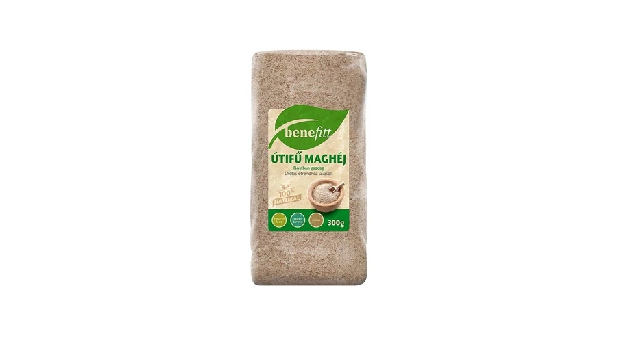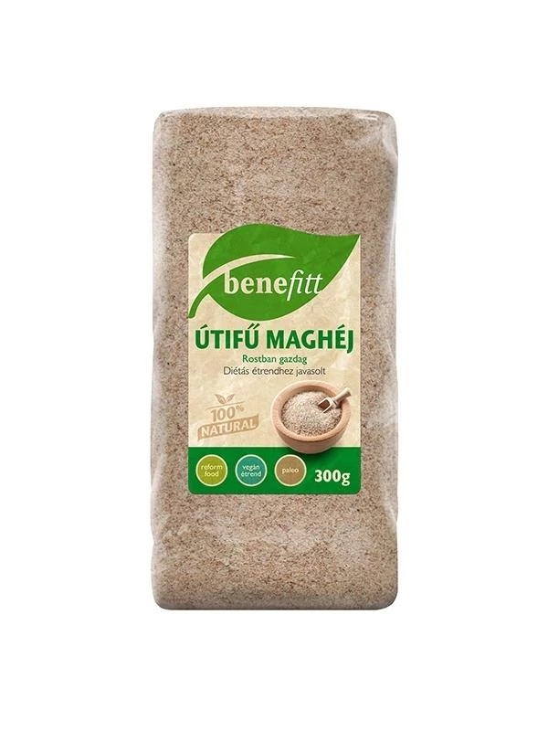 BENEFITT Útifű maghéj 300g Rostban gazdag diétás étrendhez javasolt Értékes élelmi rostforrás. Rendszeres fogyasztása támogatja a bélműködést. Hosszú távon is biztonsággal fogyasztható az emésztőrendszer és a belek tisztítására, a hasi komfortérzet fenntartására. Nettó tömeg: 300g Felhasználás: 1 evőkanállal (kb. 5g) naponta (folyadékban, joghurtban feloldva és azonnal elfogyasztva). Fogyasztása alatt ügyeljen a rendszeres napi folyadékbevitelre (min. 2 l)! Összetétel: 100% útifű maghéj (Psyllium Husk) Tápérték 100 g termékben Energia: 748 kJ (178 kcal) Fehérje: 0 g Szénhidrát: 4,0 g Ebből cukor: 0 g Keményítő: 4,0 g Zsír 0,5 g Ebből telített zsírsavak: 0g Élelmi rost: 85,0 g Ebből vízoldható rost: 73,0 g Oldhatatlan rost: 12,0 g Só: 0 mg A napi adag (5g) min. 4,2 g élelmi rostot tartalmaz. Minőségét megőrzi: a csomagoláson jelzett ideig (nap/hónap/év) Tárolás: 20° C alatt, százaz helyen. Eredet helye: India