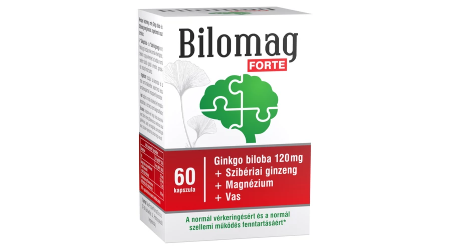 Új, egyedülálló összetételű Bilomag FORTE - 120 mg Ginkgo bilobával- és Szibériai ginzeng kivonattal, magnéziummal és vassal. A Ginkgo biloba- és a Szibériai ginzeng kivonat hatóanyagai hozzájárulnak a normál vérkeringéshez, beleértve az agyi vérkeringést is, továbbá a normál szellemi működés (például a memória, gondolkodás, tanulás) fenntartásához. Adagolási javaslat: Felnőtteknek naponta 1 kapszulát étkezés után bő folyadékkal bevenni. Figyelmeztetés: Ellenjavallt várandós és szoptató nők számára, szívbetegség, valamint magas vérnyomás esetén. Összetevők: Magnézium-oxid; Ginkgo biloba száraz levélkivonat, Szibériai ginzeng (Eleutherococcus senticosus) száraz gyökérkivonat, zselatin, vas-biszglicinát, csomósodást gátló anyag: zsírsavak magnéziumsói; színezék: sárga vas-oxid. Aktív hatóanyagok 1 kapszulában: Magnézium: 120 mg (NRV* 32%) Vas: 14 mg (NRV* 100%) Ginkgo biloba száraz levélkivonat: 120 mg - ebből flavonoidok: 28,8 mg - ebből terpén laktonok: 7,2 mg NRV: napi referencia beviteli érték felnőttek számára.