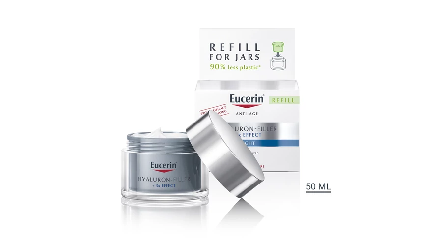 Ez a ráncfeltöltő éjszakai arckrém az öregedés első jelei ellen hat. Észrevehetően feltölti a finom redőket, sőt még a mély ráncokat is, és a bőrt fiatalosabb megjelenésűvé teszi, miközben segíti a bőr regenerálódását. Az öko-utántöltő csomagolása 90%-kal kevesebb műanyagot tartalmaz a hagyományos Hyaluron-Filler arckrémek tégelyéhez képest. Az utántöltő használatával csökkentheti a felhasznált műanyag mennyiségét, hozzájárulhat egy fenntarthatóbb és környezettudatosabb szépségápoláshoz. Az öko- utántöltő az összes Eucerin arckrém tégelyével kompatibilis.