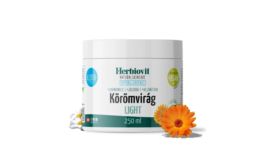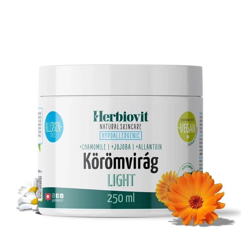 Hipoallergén hatású körömvirág krém hozzáadott természetes növényi kivonatokkal és olajjal, valamint bőrnyugtató allantoin és panthenol hatóanyagokkal. Vegán formula. Bőrápoló hatású aloe vera juice és varázsmogyoró kivonat kombinációra épülő egyedi krémbázissal. Klinikailag igazolt hipoallergén hatású termék. Független, nemzetközi laboratóriumban, dermatológiailag tesztelt hipoallergén krém extra érzékeny bőrre. Hipoallergénnek nevezzük azokat a termékeket, amelyeknek az összetevőit úgy válogatták össze, hogy minimalizálják az allergiás reakció kialakulásának valószínűségét. Az érzékeny bőr sokkal gyorsabban reagál az őt érő külső környezeti hatásokra, mint egy normál bőr. Hamar kipirosodik, esetleg viszket, szárad, repedezik a bőr. Mivel sokszor változik, így nem könnyű az érzékeny bőr ápolása. Miért fontos, ha extrém érzékeny a bőröd, hogy hipoallergén krémet használj? Mert a Herbiovit Körömvirág LIGHT hipoallergén bőrápoló krémet, úgy fejlesztettük, hogy minimalizálja az allergiás reakciók kockázatát, továbbá nem károsítja a gyulladt bőr védőrétegét és természetes savköpenyét, elősegítve ezzel például az ekcémával küzdők bőrápolását. Nagyon fontos kiemelni, hogy nagyon kevés krém rendelkezik hasonló tulajdonsággal és bőrgyógyászatilag igazolt hatással. Ami pedig a legfontosabb, hogy ez a natúrkozmetikai termékünk tisztaságának köszönhetően, megfelelő a szenzitív bőr ápolására, valamint a viszketésre, kipirosodásra hajlamos bőr napi ápolására is. Emellett krémessége és simogató illata a lélek kényeztetéséről is gondoskodik. Kozmetikai hipoallergén összetevőkkel és illatanyagokkal, mely tömény állapotban sem tartalmaznak allergén összetevőket érzékenyítő koncentrációban. A vegán, gyógynövényes natúrkozmetikumaink használatával már mindenki jóval nagyobb biztonságban érezheti magát és bőrét, aki egyetlen összetevőre sem allergiás, azonban, aki tisztában van a saját túlérzékenységével, neki ezt a krémünket ajánljuk. Bátran próbáld ki. Bőrbarát ápoló készítmény komplex hatóanyagokkal, mely kedvezően hat a kisebb bőrgyulladások tüneteinek ápolására és kisebb sérülések gyógyulásának elősegítésére. Használható rovarcsípések okozta bőrgyulladás esetén is. Komplex összetevői intenzíven táplálják a bőrt, megóvják a kiszáradástól és a kipirosodástól. Nyugtatja az allergiás (pl. napozás, rovarcsípés), igénybevett (pl. epilálás), külső környezeti hatások, ártalmak által (pl. szél, hideg idő) irritált bőrt. A benne található körömvirág virágfészkeinek olajos kivonatainak és a krémben található hatóanyagoknak köszönhetően antimikrobiális, gyulladáscsökkentő, antioxidáns, hámosító, sebgyógyító és immunstimuláns hatásokkal rendelkezik. A készítményben található kamilla kivonat bőrnyugtató, gyulladáscsökkentő, regeneráló hatású. A jojobaolaj egy természetes növényi olaj, mely kiváló összetevő a pattanásokra hajlamos bőr számára, mert képes csökkenteni a faggyútermelést az aknekezelésektől kiszárított bőrben. Mind a zsíros, mind a száraz bőr számára remek emollient és hidratáló anyag. Klinikailag igazolt hipoallergén hatású termék. Zéró allergia. Bőrbarát. Kíméletességét bőrgyógyászati tesztek igazolják. Nem tartalmaz szintetikus illatanyagot és színezéket, állati eredetű- és ásványi olaj alapú összetevőket. Vegán. Állati eredetű anyagot nem tartalmaz. Herbiovit Körömvirág hipoallergén krém használata: Naponta vidd fel a kívánt bőrfelületre és lágyan masszírozd a bőrbe. Minden bőrtípusra alkalmazható! Kizárólag külső használatra! A natúr tisztaságú összetétel megőrzése érdekében a termék használata során ügyelj arra, hogy tiszta kézzel nyúlj a tégelybe. A szemmel, a nyálkahártyákkal és a nyílt sebekkel való érintkezést kerüld! Gyermekektől elzárva tartandó! Gyártási azonosító jelölve a tégelyen. Tárolás: 10-25 °C hőmérsékleten, fénytől és hőtől távol tartandó. INCI: Aqua, Cetearyl Alcohol, Stearic Acid, Helianthus Annuus Seed Oil, Isopropyl Myristate, Cocos Nucifera Oil, Calendula Officinalis Flower Extract, Aloe Barbadensis Leaf Juice, Simmondsia Chinensis Seed Oil, Tocopheryl Acetate, Panthenol, Hamamelis Virginiana Extract, Chamomilla Recutita Flower Extract, Glycerin, Allantoin, Beta-Carotene, Phenoxyethanol, Glyceryl Stearate SE, Ceteareth-25, Propylene Glycol, Ethylhexylglycerin, Parfum*, Sodium Hydroxide, Ascorbyl Palmitate. *allergénmentes illatkomponens