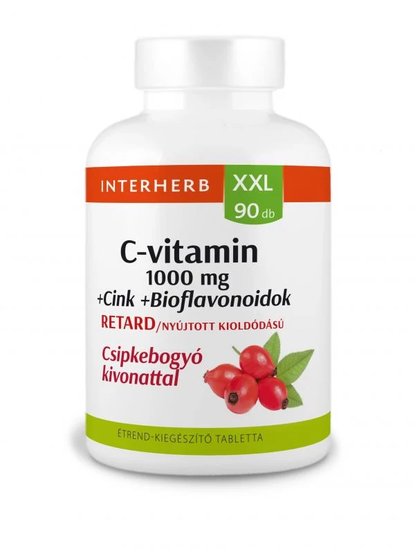 Retard/Nyújtott kioldódású étrend-kiegészítő tabletta Csipkebogyó kivonattal 90 db, XXL kiszerelés Kurkuminnal színezett, bevonatos étrend-kiegészítő tabletta Nettó tömeg: 121,5 g A C-vitamin és a cink hozzájárul: az immunrendszer normál működéséhez a sejtek oxidatív stresszel szembeni védelméhez A C-vitamin segíti a fáradtság és a kifáradás csökkentését, míg a cinknek szerepe van a normál szellemi működés fenntartásában. Összetevők/tabletta: aszkorbinsav (C-vitamin); tömegnövelő szerek: mikrokristályos cellulóz, hidroxipropil-metil-cellulóz, polidextróz, talkum; Csipkebogyó kivonat; fényező anyag: poli(vinil-alkohol); citus bioflavonoidok; csomósodást és lesülést gátló anyagok: zsírsavak magnézium sója, szilícium-dioxid; stabilizátor: poli(etilénglikol); cink-oxid; színezékek: titán-dioxid, kurkumin. Hatóanyag/1 tabletta (napi adag): C-vitamin: 1000 mg NRV*%: 1250% Cink: 5 mg NRV*%: 50% Citrus bioflavonoidok: 10 mg ebből heszperidin: 8,5 mg Csipkebogyó kivonat: 25 mg *NRV – felnőttek számára ajánlott napi beviteli referenciaérték százalékban kifejezve. Javasolt fogyasztás: napi 1 tabletta. Lehetőleg étkezést követően min. 2 dl vízzel, szétrágás nélkül vegye be. Figyelmeztetés: Az étrend-kiegészítő fogyasztása nem helyettesíti a kiegyensúlyozott vegyes étrendet és az egészséges életmódot. Az ajánlott napi adagot ne lépje túl! Tárolás: szobahőmérsékleten (15-25 ºC). Gyermekektől elzárva tartandó!