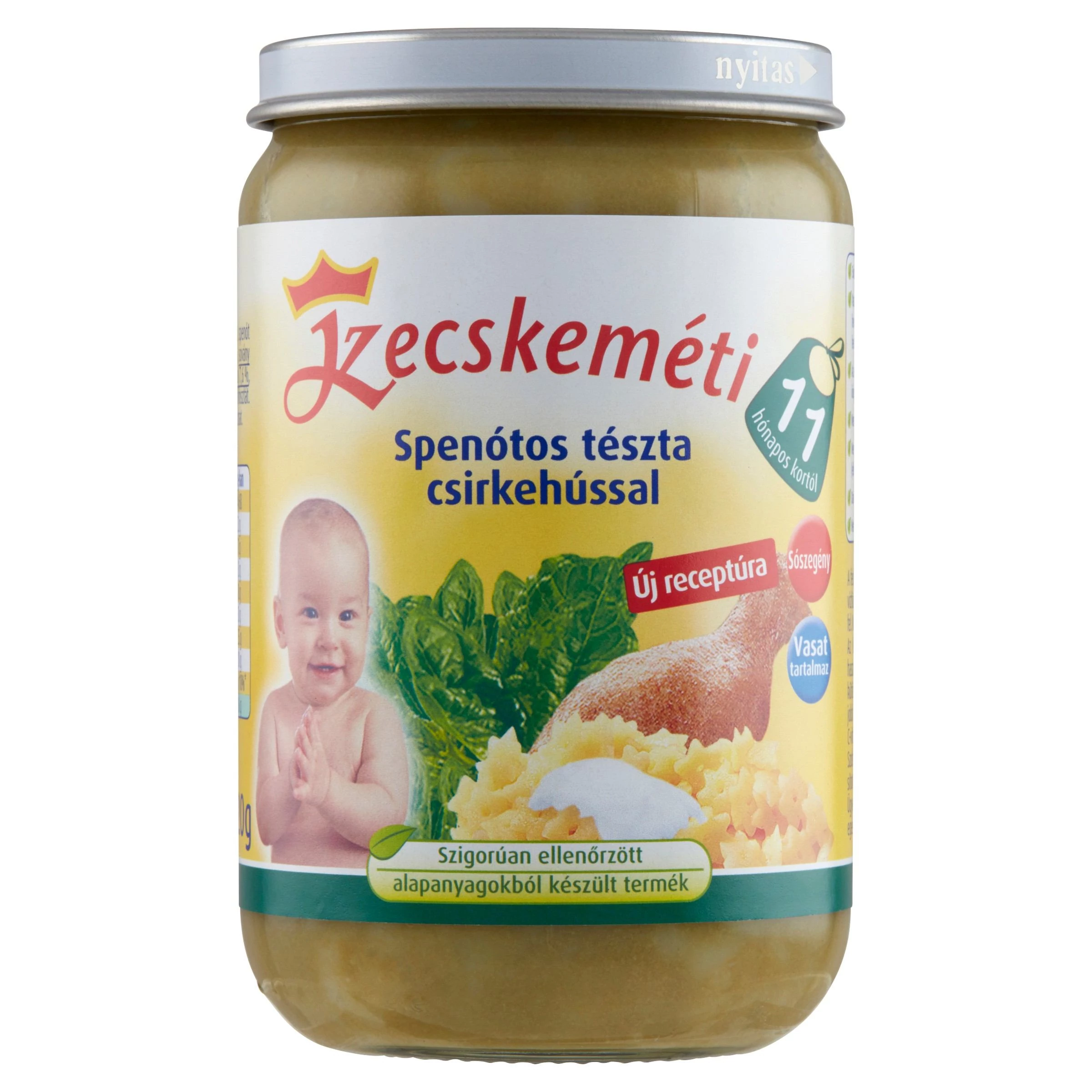 A fedél lecsavarása után a szükséges mennyiséget vízfürdőben vagy mikrohullámú sütőben melegítse fel. Keverje meg, majd ellenőrizze a hőmérsékletet. A vas jobb felszívódása érdekében desszertként C-vitamin-tartalmú gyümölcspép fogyasztása ajánlott. Az üveg sérülésének elkerülése érdekében ne használjon fémkanalat. Vásárlás előtt ellenőrizze a csomagolás sértetlenségét. Ügyeljen gyermeke kiegyensúlyozott táplálására és egészséges életmódjára. A fel nem melegített rész hűtőben lefedve 1 napig tárolható. Szobahőmérsékleten tárolható. Minőségét megőrzi: a fedélen feltüntetett időpontig. Ajánlott 11 Hó. Összetevők: Zöldség 26% (burgonya 16%, spenót 10%), Ivóvíz, FŐTT TÉSZTA (DURUMBÚZA) 21%, SOVÁNY TEJ, Csirkehús 8%, ŐRÖLT FŐTT TÉSZTA (DURUMBÚZA) 7,6%, TEJSZÍN, Repceolaj 0,8%, Jódozott só, Vas-difoszfát Allergén információ-Tartalmaz: Glutént tartalmazó gabonafélék, Tej, Búza Tartalmazhat: Tojás.