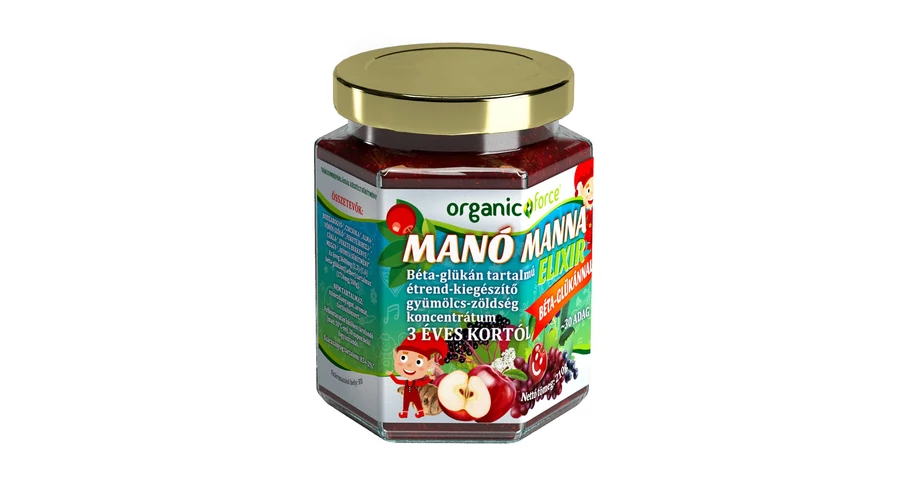 100% természetes gyümölcs-zöldségsűrítmény béta-glükánnal Manó Manna Elixír, természetes vitamintartalmú, magas antioxidáns hatású koncentrátum, béta-glükánnal a fertőző betegségekkel szembeni védelemért, gyerekeknek 2,5 - 3 éves kortól Szuperkoncentrátum: • Hazai gyártó által, 100%-ban természetes, kiváló, részben bio minőségű, összetevőkből készült gyümölcs-zöldségsűrítmény, • magas antioxidáns hatású, magas flavonoid és polifenol tartalmú szuperkoncentrátum (szárazanyagtartalma: 82%!) • immunrendszert aktiváló béta-glükán összetevővel • Kizárólag természetes anyagokat tartalmaz, hozzáadott cukrot, tartósítószert, színezőanyagot NEM. • Alacsony hőfokon, speciális eljárással készült, hogy a hatóanyagokat semmilyen károsodás ne érje • Támogatja a kiegyensúlyozott és tápanyagokban gazdag étkezést Összetevők: A Manó Manna Elixír egy szuperkoncentrátum, amely Yestimun béta-glükánt és 9-féle - magas vitamin és hatóanyag tartalmú - gyümölcs-zöldség sűrítményét tartalmaza: bodzabogyó, csicsóka, almarost, vörös szőlő, fekete ribizli, cékla, fekete berkenye, meggy, áfonya • Bodzabogyó: megfázás kezelésére kiváló, hatása van különféle légúti kórokozó vírussokkal szemben, segíti a vírusellenes védekezést • Alma: magas flavonoid tartalmú immunerősítő • Fekete ribizli: C-vitaminban gazdag, kiváló vasforrás, magas pektintartalma jó hatással van a bélflórára, tartalmaz A-vitamint, B1-, B2-, B6-vitamint, E-vitamint, magnéziumot és foszfort is • Fekete berkenye: gyulladáscsökkentő, B2, B6 és C-vitamin forrás, erősíti az immunrendszert, támogatja a szív-és érrendszert, emésztést • Meggy: gyulladásgátló és antibakteriális, antivirális hatású; magas A-vitamin, B-vitamin, kálium, magnézium és vas tartalmú, • Áfonya: kiváló antioxidáns és gyulladáscsökkentő hatású • Vörös szőlő: magnézium, folsav, vas és B-vitamin forrás, regeneráló hatású antioxidáns, béltisztító; • Cékla: javítja az általános egészségi állapotot, erősíti az immunrendszert, az egyik leghasznosabb vasforrás; • Csicsóka: immunműködést támogató, bélflórát helyreállító összetevő. + • Béta-glükán (napi adagban 120 mg/teáskanálnyi) számtalan tanulmány szerint aktiválja az immunműködést, folyamatos szedése állandó, hatékony védőpajzsot nyújt a vírusos és bakteriális fertőzésekkel, fertőző megbetegedésekkel szemben, csökkentheti a fertőző betegség gyakoriságát, tüneteit, időtartamát. Béta-glükán tartalom a napi adagban 120 mg/teáskanálnyi koncentrátum. Adagolás: Manó Mannát elsősorban óvodás, kisiskolás korú gyermekek szervezetének természetes vitaminpótlására, fertőző betegségek megelőzésére ajánljuk 2,5 - 3 éves kortól. • Napi adag 1 teáskanálnyi koncentrátum megelőzésre. • Betegség jeleinél napi 2 teáskanál, erősebb tüneteknél napi 3-4 teáskanál javasolt a tünetek fennállásáig, szétosztva a nap folyamán. • A készítmény a gyakorlat szerint 1,5 éves kortól is adagolható napi 1 mokkáskanálnyi adagban, mely duplázható betegség jelei esetén. • A napi adag igény szerint belekeverhető nem meleg folyadékba, vízbe, szörpbe, teába, ételbe is. Édesíthető ízlés szerint. • 1 üveg kb. 30 teáskanálnyi (kb. 60 mokkáskanálnyi) adagot tartalmaz. Napi 1 teáskanál vagy 2 mokkáskanál már hatékonyan képes támogatni a gyermek szervezetének működését. Folyamatosan adagolható, a kívánt hatás eléréséhez őszi-téli időszakban napi rendszerességgel szükséges, nyáron szüneteltethető vagy csak szükség esetén fogyasztandó. Kinek és mikor ajánlott a Manó Manna Elixír? • ha gyermeked elmúlt 2,5 - 3 éves • ha természetes vitaminforrást keresel a számára • ha gyermeked nem eszik elegendő mennyiségű zöldséget, gyümölcsöt és hatékonyan szeretnéd támogatni a napi zöldség-gyümölcs bevitelét • ha aggódsz, hogy esetleg a nagyobb testvérektől elkapja a betegségeket • ha gyermeked óvodába vagy iskolába jár, így fokozottan ki van téve a különböző fertőzéseknek • fertőzésveszély vagy • influenzajárvány idején • őszi, téli időszakban folyamatosan • a meghűlés vagy torokfájás, egyéb fertőző betegségek első jelére, • ha gyermeked immunrendszerét támogatni, védeni, erősíteni szeretnéd • legyengült immunrendszer esetén, hosszú betegség után Az egyedi technológiának köszönhetően megmarad az eredeti íz, zamat és aroma, az illat és a színanyagok, valamint a vitaminok, a makro- és mikroelemek, és a biológiailag aktív összetevők - koncentrált formában. A gondosan összeválogatott komponensek erőteljes antioxidáns hatásúak a bennük található jelentős polifenol és flavonoid tartalom miatt. Jelentős mennyiségű olyan összetevő került a termékbe (cékla, alma, csicsóka), amely nemcsak antioxidáns hatása miatt fontos, hanem garantálja a tökéletes felszívódást is. Figyelem! A termék állaga nem hasonlít a piacon lévő lekvárok állagához, ugyanis a magas hatóanyagtartalom, rosttartalom és szárazanyag tartalom, valamint a benne található Yestimun Béta-glükán miatt sűrűbb, koncentráltabb az állaga, ezért nem sima lekvár, hanem szuperkoncentrátum.