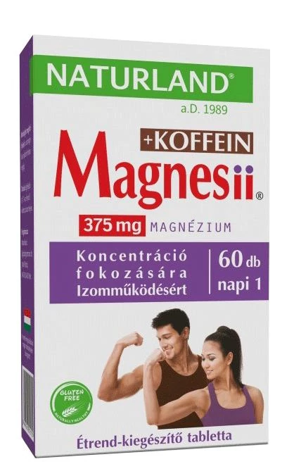 A magnézium hozzájárul a normál izomműködéshez,a fáradtság és a kifáradás csökkentéséhez, az elektrolit-egyensúly fenntartásához, valamint az idegrendszer megfelelő működéséhez. A magnézium részt vesz a normál csontozat fenntartásában és a normál energiatermelő anyagcsere-folyamatokban. A koffein segít az éberség és a koncentráció fokozásában. Hatóanyagok a napi adagban (1 tabletta): Magnézium: 375mg (100% NRV) Koffein: 100mg NRV: Napi beviteli referenciaérték %-a felnőttek számára. Összetevők: Magnézium-oxid, koffein, kukoricakeményítő, színezékek(karamell, kármin), csomósodást gátló anyag (zsírsavak magnéziumsói). (EU és nem EU) Adagolás: felnőtteknek napi 1 tabletta folyadékkal lenyelve