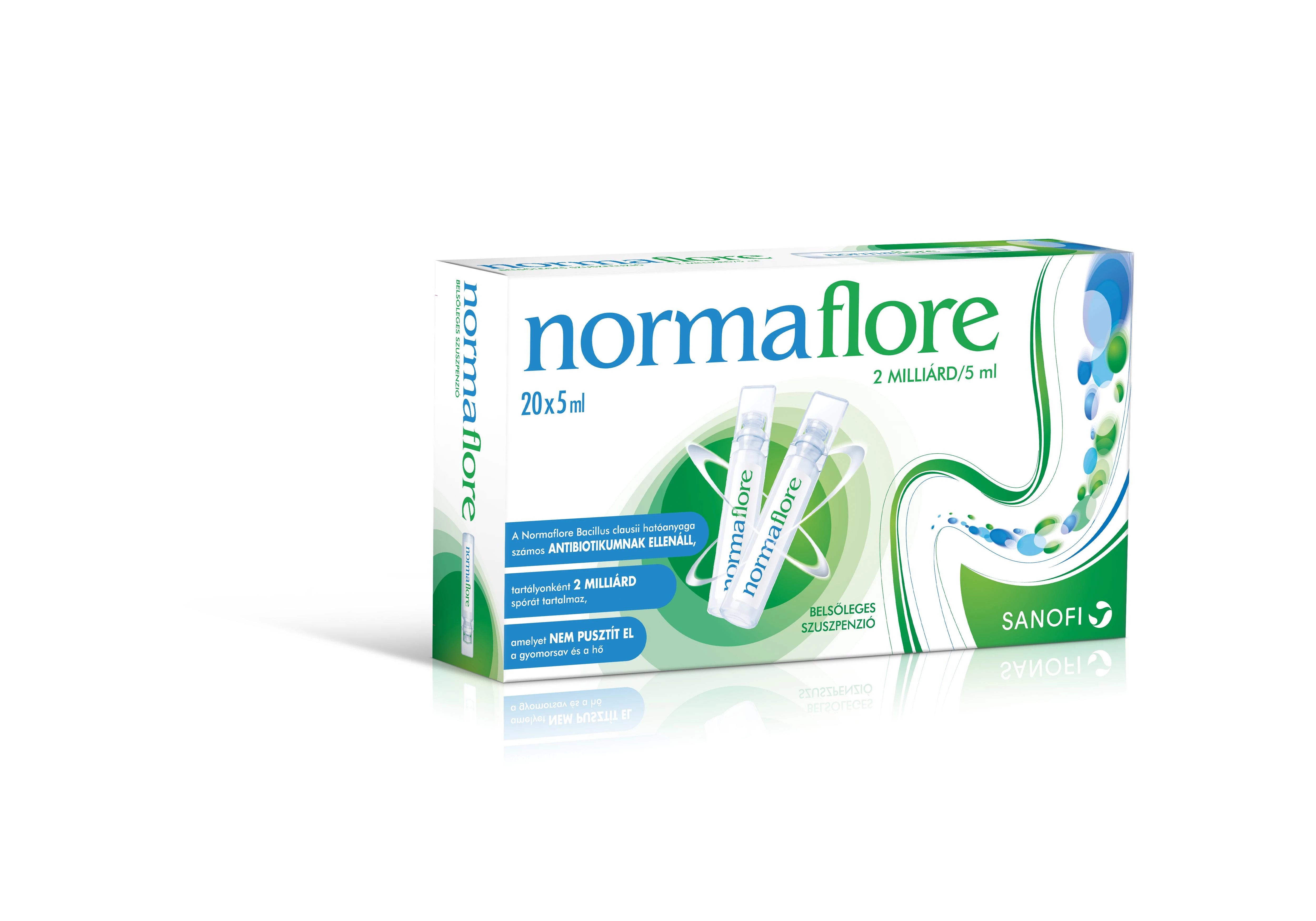 A gyógyszer minősítésű Normaflore 4 irányú védelmet biztosít antibiotikum-kúra esetén: megelőzi az antibiotikum okozta bélflóra károsodást, csökkenti a hasmenés kialakulásának esélyét; helyreállítja a bélflóra egyensúlyát; hozzájárulhat a szervezet védekezőképességéhez. A Normaflore egyedülálló hatóanyaga rendkívül ellenálló: nem pusztítja el a gyomorsav, a hőhatás és ellenáll 14-féle antibiotikum hatóanyagnak, hogy épségben leérve kifejtse hatását és megelőzze az antibiotikum okozta bélflóra károsodást. Használata könnyű, a benne lévő folyadék bármilyen alkoholmentes itallal bevehető. Bacillus clausii spórát tartalmazó, vény nélkül kapható gyógyszer.