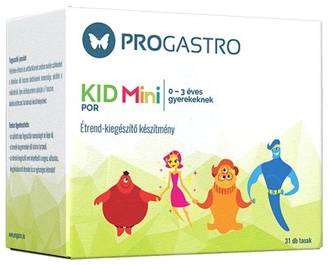 A ProGastro KID Mini - 7 féle, a bélcsatorna mikroflórájában is megtalálható élőflórát tartalmaz. Termékünk a világon egyedülálló ProbioAct® technológiával készült, mely biztosítja a baktériumok élettartamát, stabilitását és minőségét. A ProGastro KID Mini glutén-, tejfehérje-, laktóz és mesterséges adalékoktól mentes, valamint semmilyen állati eredetű összetevőt nem tartalmaz. Kinek ajánljuk? Egészséges újszülötteknek 0 éves kortól, gyerekeknek 3 éves korig. Hogyan alkalmazd a gyermekednek? Naponta 1 tasak (1 g) port keverj el kb. 1 dl szobahőmérsékletű vízben, teában, gyümölcslében, tejben vagy bármilyen pépes ételben, pl. joghurtban, zabkásában, tejberizsben, tejbegrízben, főzelékekben. Kicsiknek tápszerben elkeverve is adható. Fogyasztása naponta egyszer javasolt. Meddig szedje a gyermeked? Használható folyamatosan, illetve kúraszerűen. Kúraszerű használatnál minimum 2 doboz elfogyasztása javasolt. 1 doboz 31 napra elegendő. Mekkora a csíraszáma? Csíraszám: >= 1 x 109 CFU / 1 g. Egy tasak 1 g port tartalmaz. Hogyan tárold? Kisgyermekektől elzárt helyen, szobahőmérsékleten. Összetevők: rizskeményítő, maltodextrin, inulin P7, frukto-oligoszacharid P7, baktériumtörzsek: Bifidobacterium lactis W51, Bifidobacterium lactis W52, Lactobacillus acidophilus W55, Lactobacillus casei W56, Lactobacillus rhamnosus WGG, Lactobacillus salivarius W57, Lactococcus lactis W58. A ProGastro KID Mini: gluténmentes, tejfehérje- és laktózmentes, szacharózmentes, semmilyen állati eredetű összetevőt nem tartalmaz, mesterséges adalékoktól mentes.