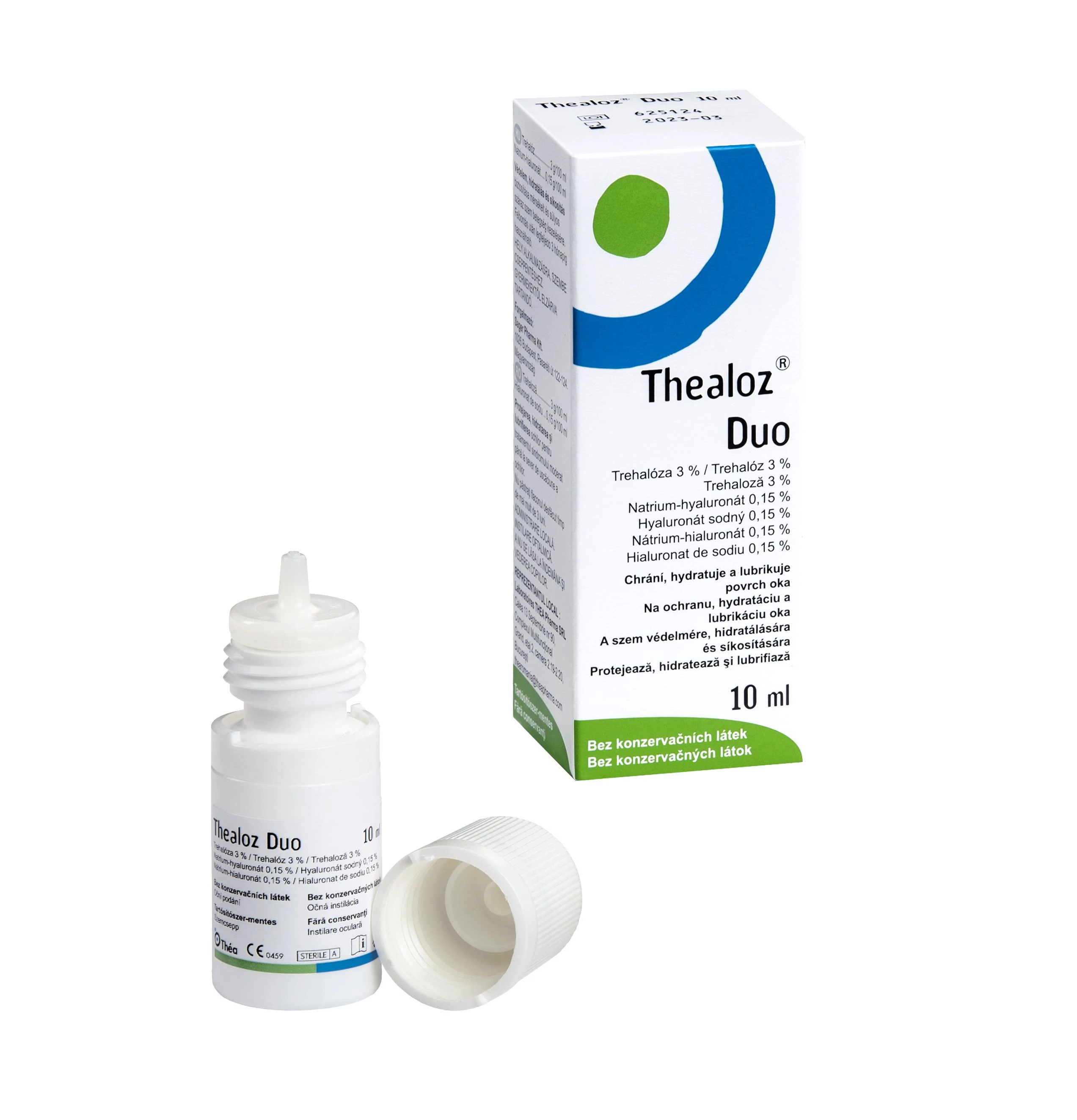 A Thealoz Duo két fő összetevőt, a nátrium-hialuronátot és trehalózt tartalmaz . A nátrium-hialuronát tartós hidratálást a trehalóz sejtvédelmet, szemfelszíni regenerációt biztosít. Ugyancsak a trehalóz összetevőnek köszönhetően hatékony regenerációt biztosít az UVB sugarzás okozta károsodás után. A Thealoz Duo tartósítószer-mentes az ABAK tartálynak köszönhetően, felbontás után 3 hónapig eltartható. Minden típusú kontaktlencsével található.